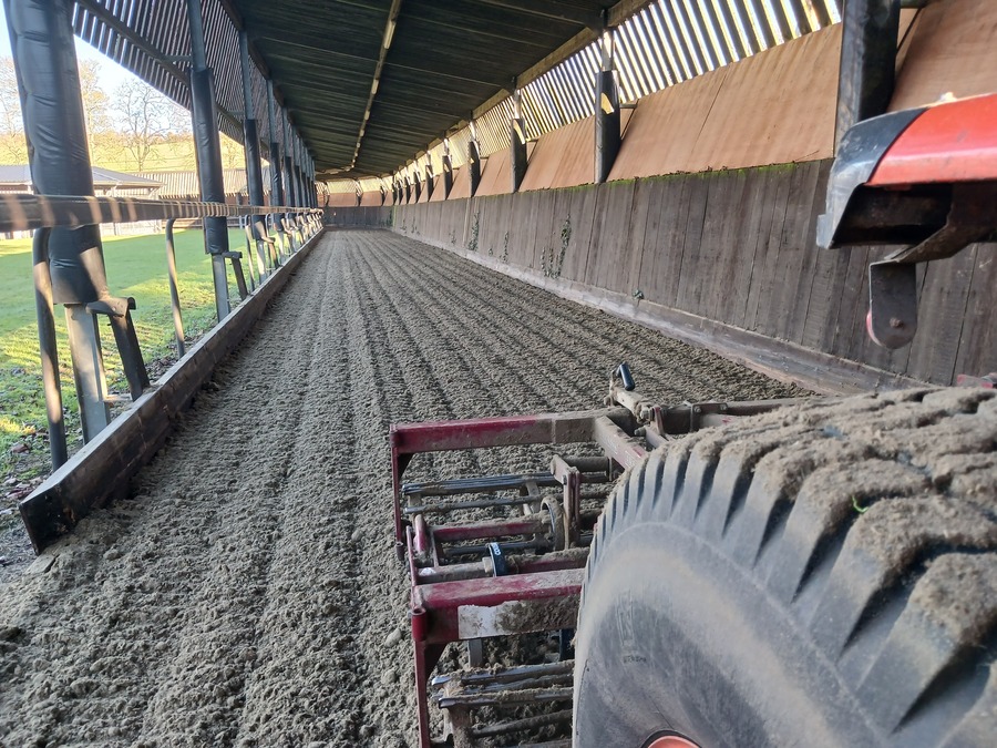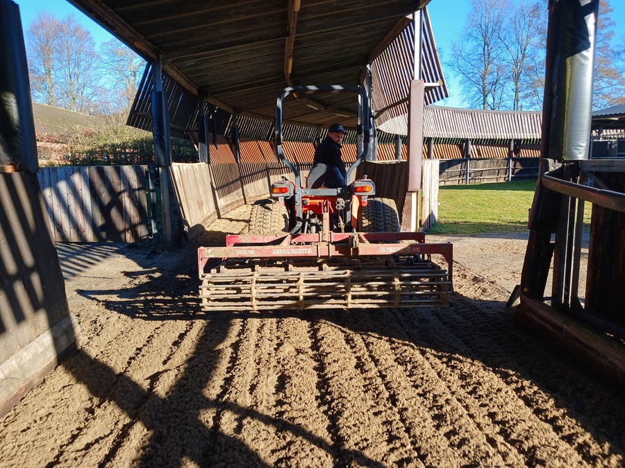 The fibresand surface of a covered training track carries an enormous daily workload and its condition has a direct effect on the wellbeing and performance of the horses who use it. Over time the fibresand naturally compacts, the structure tightens, and the material drifts towards the bends, even when the surface is well maintained. Eventually the point comes when routine harrowing is no longer enough to keep the track in its best state.